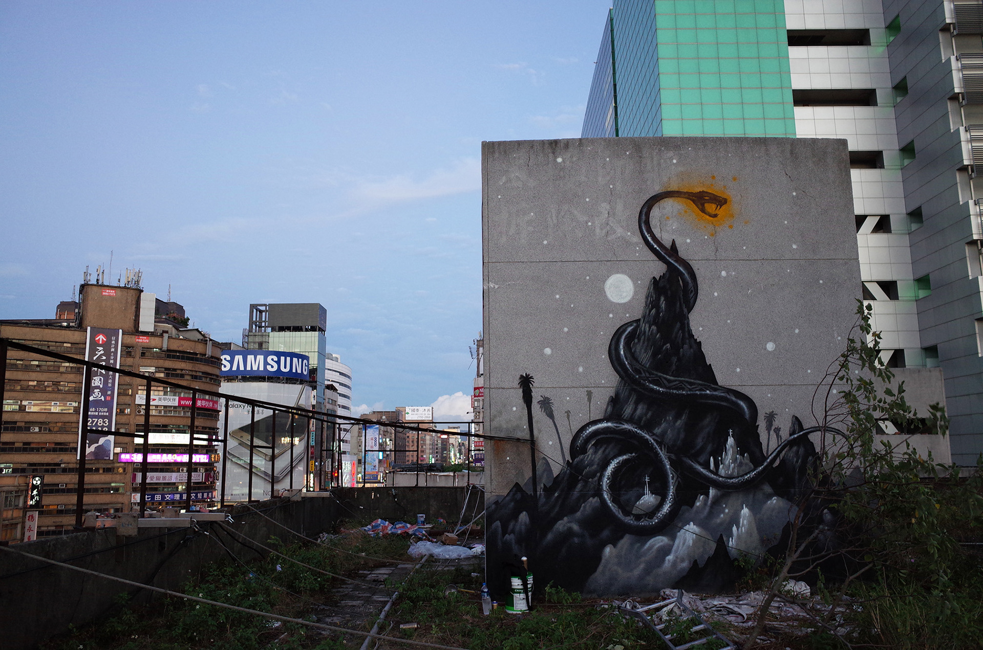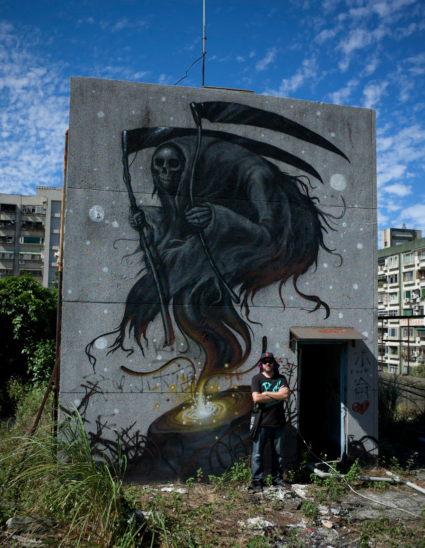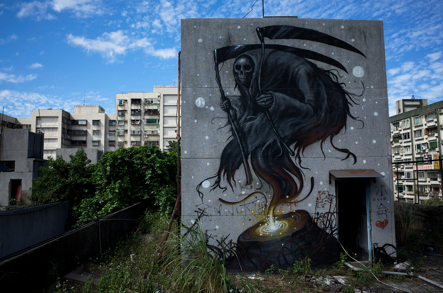 Overlooking downtown Taipei, these three walls (Reaper, Owl, and Snake) represent heroic and tumultuous times in Taiwan's history.