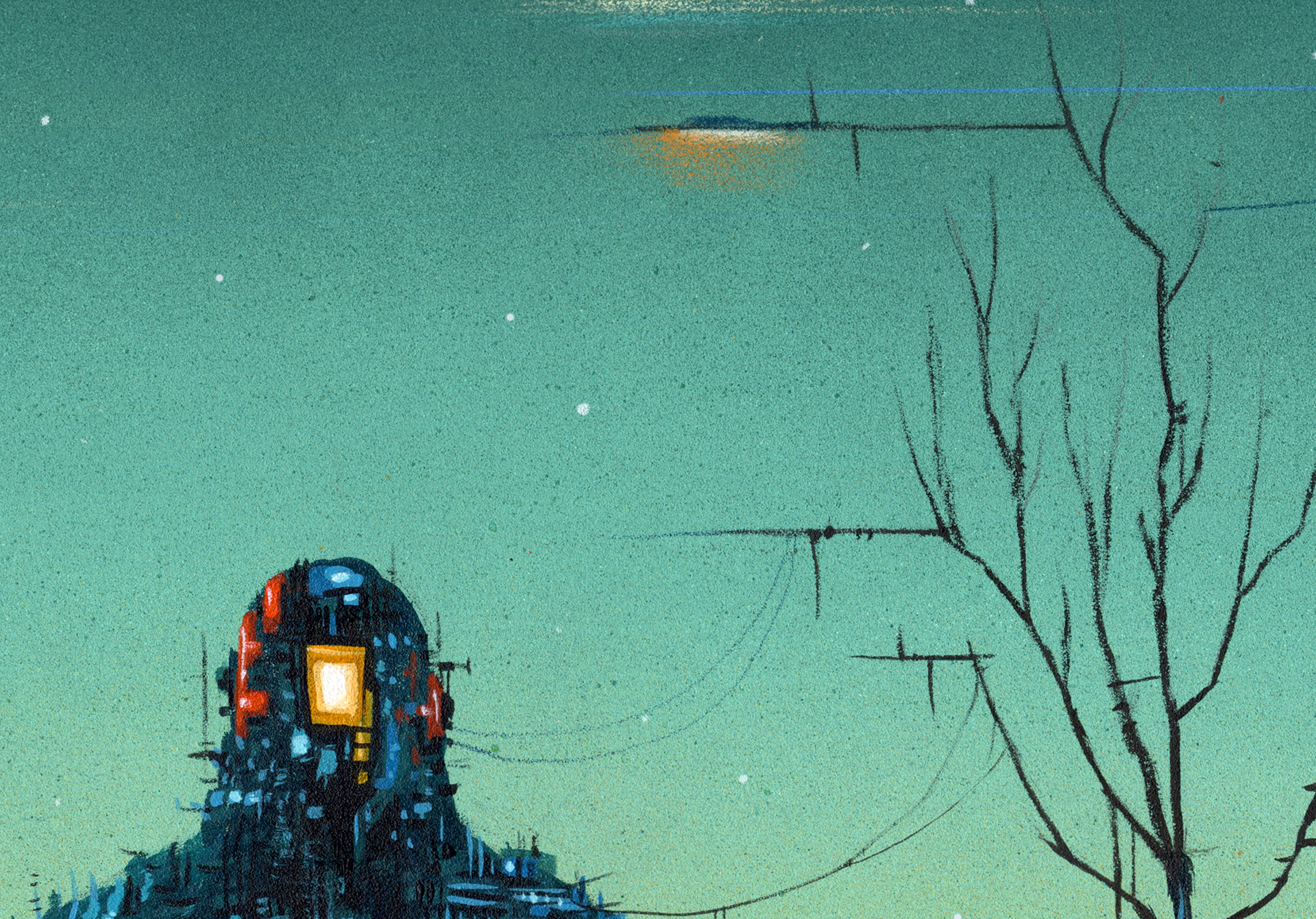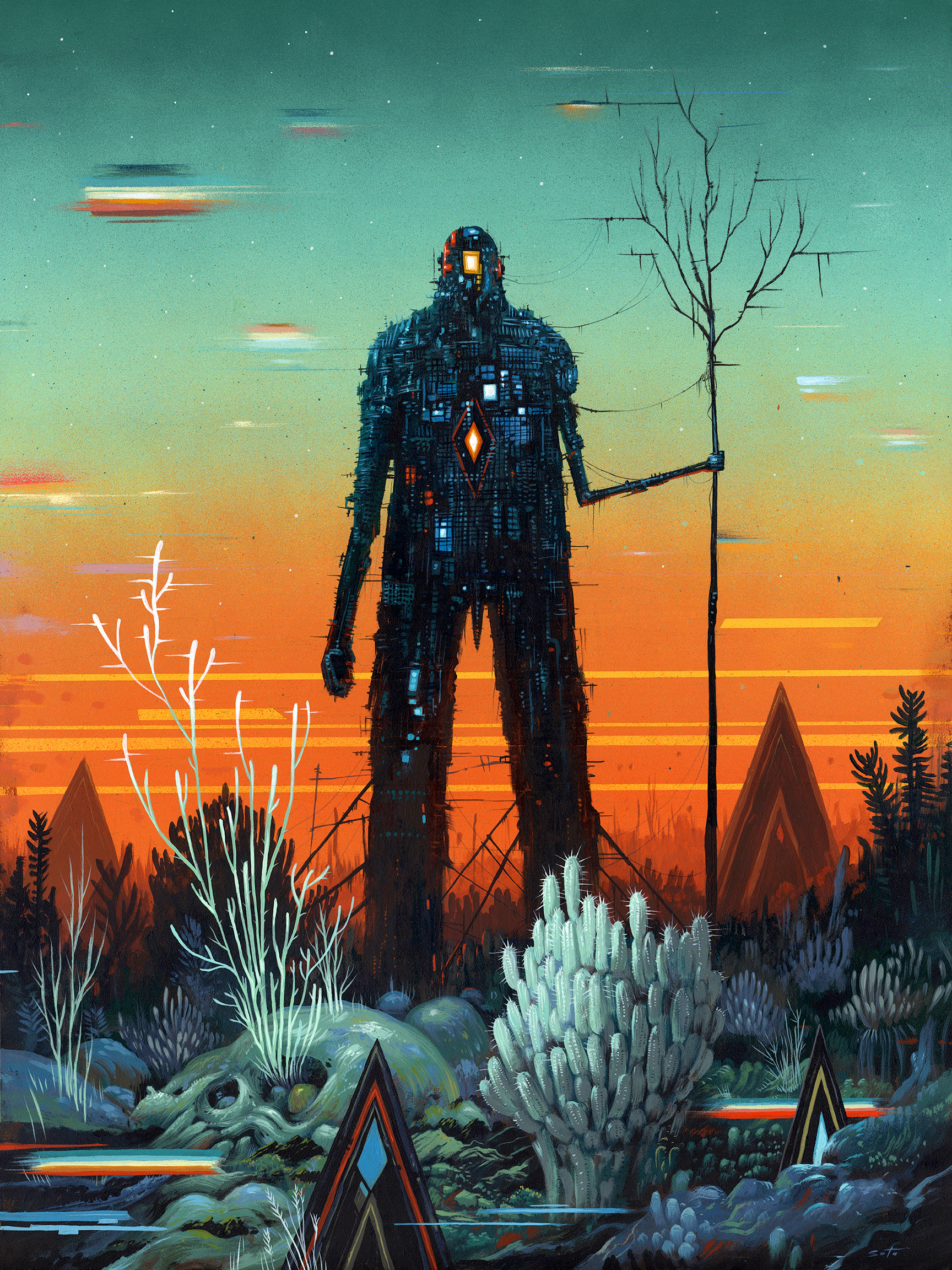 The massive Wickerman overlooks the wild overgrowth of a future Los Angeles sunset.